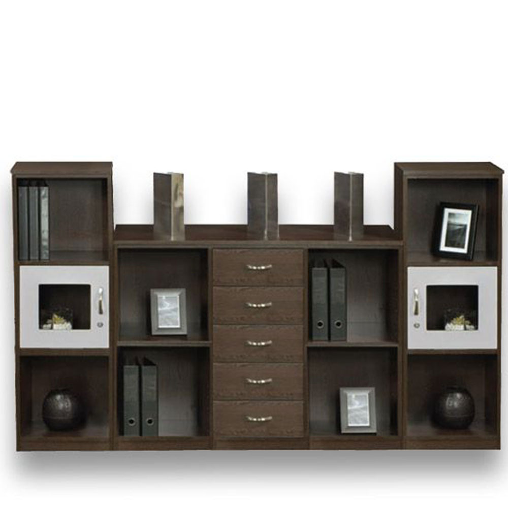 Base Unit 2 x 750H x 900W x 600D Hinge Door Cupboards 1 x 750H x 900W x 600D 2 Drawer Side Filer Top Unit 1 x 1200H x 900W x 350D Glass Bookcase 1 x 1200H x 900W x 350D Cocktail Unit 1 x 1200H x 900W x 350D Hinge Door Unit