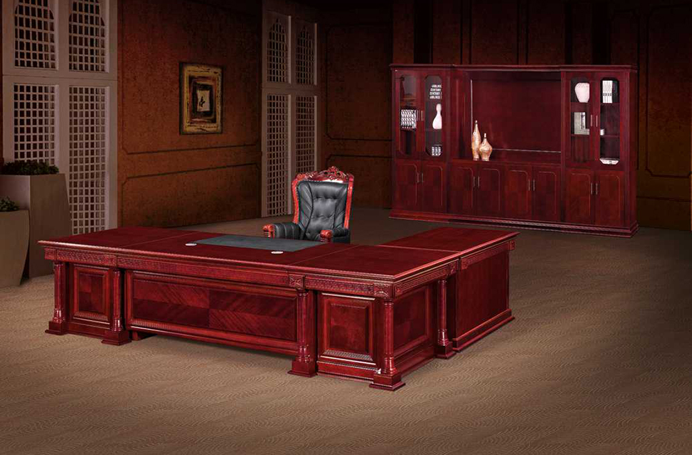 A staple for your executive office furniture, this Presidential Executive Desk is made from a mahogany veneer and features and a 150mm thick desk top with a pencil tray. A black leather inlay protects the desk top and distinguished wooden sculpture image contributes to its intricate beauty – suited for executive office furniture. Cable holes are provided for ease of use, finished in brushed aluminium. Includes matching free standing credenza which provides stylish storage space as well as a three draw mobile pedestal with central locking.